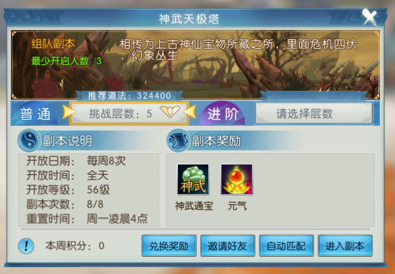 神武天极塔是56级开放的组队爬塔副本,每周可挑战8次,奖励包括经验、神武通宝和元气。玩家可通过活动界面直接进入,队长可选择整五或整十层作为起点,系统会根据队伍最低层数判断可进入的层数。通关需要击杀小怪和BOSS,层数越高奖励越丰厚,神武通宝可兑换阵灵小白、法宝多情环等珍稀道具。