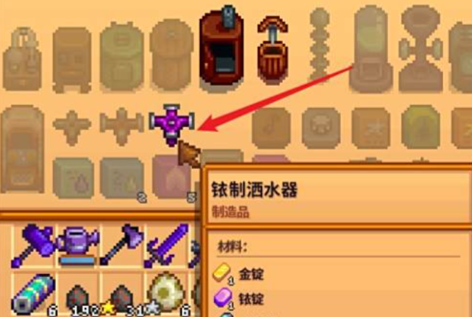 除了自己制作,还能直接找铁匠格斯购买洒水器。初级洒水器价格是500G,覆盖3x3的范围。如果你手头宽裕,直接购买能省去收集材料的麻烦。格斯还提供洒水器升级服务,支付金币和对应矿石就能扩大灌溉范围。铜矿石、铁矿石、金矿石都能用来升级,具体需求根据洒水器类型决定。