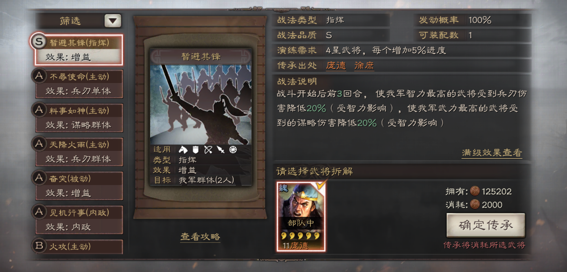 兵种适性进一步限定了夏侯惇的武器发挥场景。骑兵S级适性使其在冲锋作战中能最大化属性优势,盾兵A级则适合持久防御战。实战中需避免对抗谋略队伍,因其战法依赖兵刃伤害触发。武器(战法)选择优先级为:优先覆盖嘲讽与回复(如合军聚众自愈),其次补充反击伤害(如气凌三军后发制人),最后考虑控制强化(如魅惑)。这种梯度配置确保了其在开荒与PVP中的稳定性。后期阵容中,夏侯惇的武器定位更偏向功能性辅助。与曹操、满宠等武将组队时,其战法需适配团队需求,例如携带锋矢阵增强主将输出,或搭配陷阵营提供群体治疗。