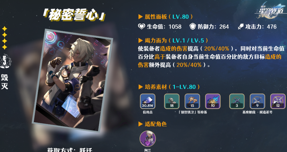 如果没有专属光锥,四星的秘密誓心就是最好的替代选择。虽然基础属性稍逊一筹,但它的增伤效果非常强力。当你的生命值比敌人低时,还能触发额外伤害加成。由于刃会不断消耗生命值,这个效果很容易触发。满精炼的秘密誓心甚至能接近专属光锥的伤害水平,是性价比极高的选择。