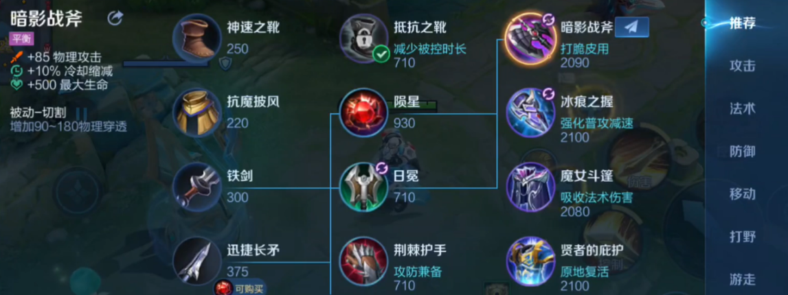 中期核心装备转向攻防平衡,破甲弓或暗影战斧是关键选择,提供物理攻击和破甲效果,显著增强关羽的爆发输出;同时添加暴烈之甲或不祥征兆,提升物理防御和生命值,应对敌方物理伤害的集中火力;此阶段装备组合支持关羽在冲锋姿态下释放一技能和二技能时打出高额伤害,同时避免被集火秒杀,高手应根据敌方阵容偏物理或法系灵活替换,例如若法系威胁大,可临时选用抵抗之靴变体来缓冲法术攻击。