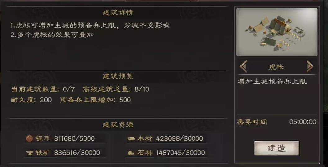 九级地还能建造虎帐,这是提升军事能力的重要设施。虎帐需要玩家名声达到6000才能建造,其作用是增加主城预备兵的上限。预备兵是快速补充部队兵力的关键资源,虎帐的等级越高,预备兵储备量越大,在频繁作战时能显著提升持续作战能力。需土匪势力无法建造虎帐,这体现了正规军在战略发展上的优势。