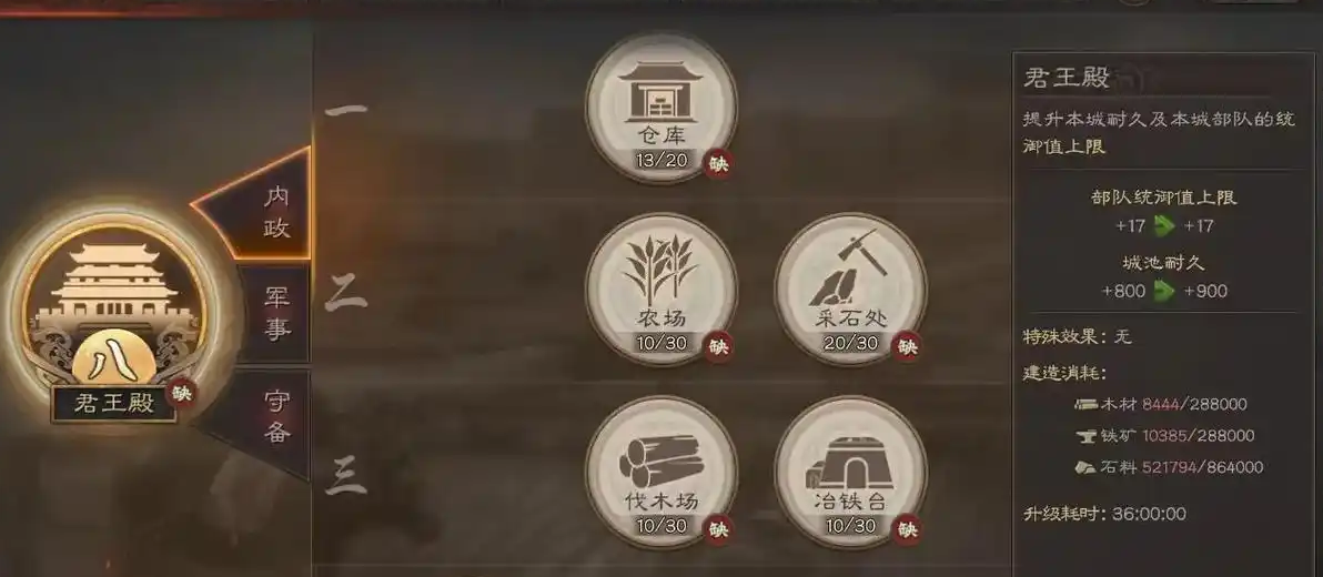 九级地作为高级资源地,具有重要的战略价值。玩家可以在九级地上建造仓库,该建筑能显著提升资源存储上限。建造仓库需要达到6000名声值,每增加2000名声可额外建造一个仓库。一级仓库可增加40万资源存储量,九级仓库上限为30万。仓库的主要功能是扩展资源储备空间,但不会直接提升资源产出效率。