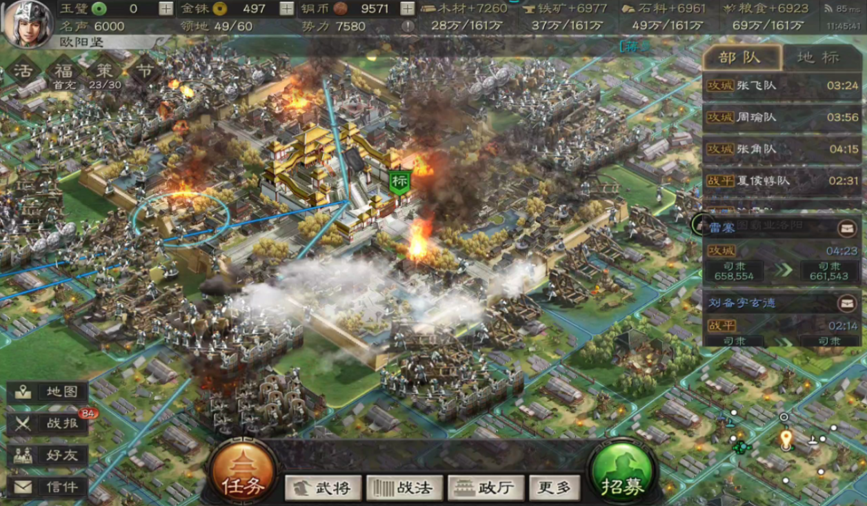 围困洛阳是赛季末期的关键战略目标,需要同盟成员高度协同配合。洛阳作为十级城池,守军由3个50级橙将组成,兵力配置与10级地相当,其中吕布带兵150万,曹性和魏续各带30万,必须先击败两名副将才能进攻吕布主力。攻打洛阳前需确保主力武将达到45级以上且兵力超过2.8万,器械队则要求三名武将均达30级并满建筑加成。