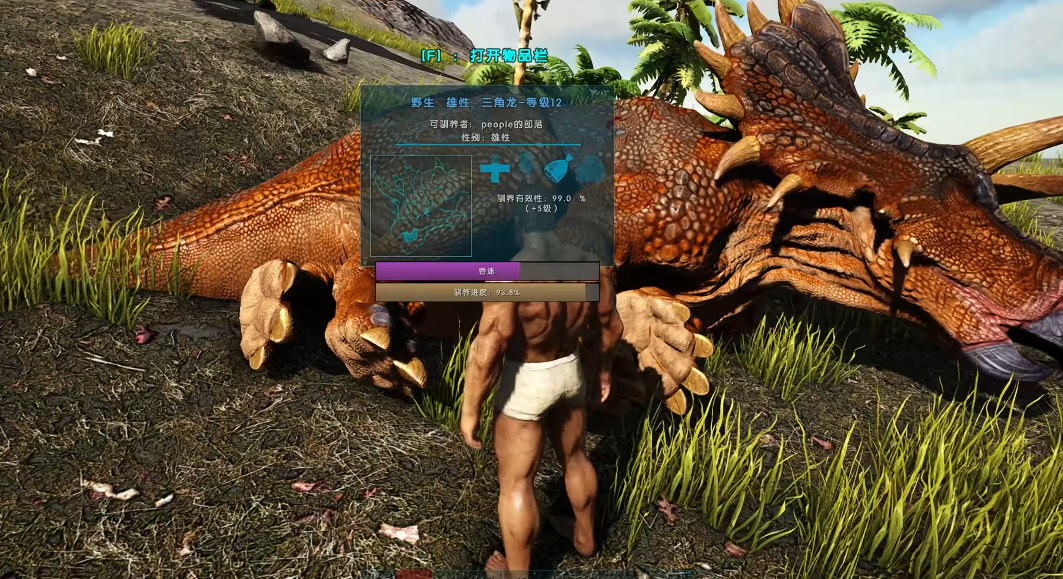 驯服三角龙时,记得别打它的头,因为头部有免伤效果,麻醉箭射身体或者脚更容易让它晕倒。晕倒后打开它的背包,放入准备好的食物,紫色浆果或者其他颜色的浆果都可以,但紫色浆果效果最好。如果它暂时不饿,可以强制喂点白果子降低饱食度,但别喂太多,否则会影响眩晕值。