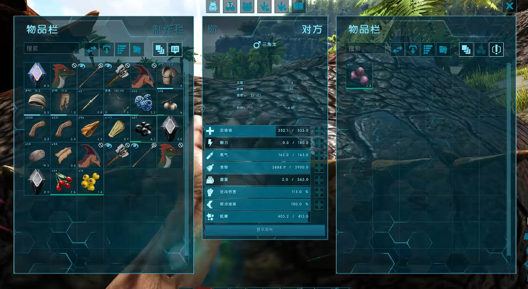 驯服成功后,三角龙会成为采集浆果的小能手,尤其是紫色浆果,效率比手动采集高很多。骑乘时还能用冲刺攻击,对付中小型生物非常实用。平时记得多喂它爱吃的食物,保持饱食度,这样它才能更好地帮你干活。