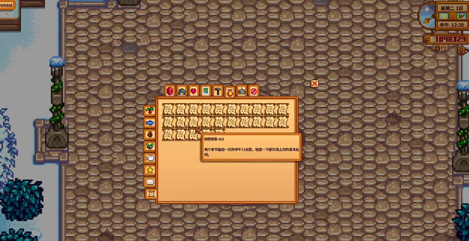 任务奖励为石祝尼魔雕像,这是一种装饰性物品,可放置在农场或住宅内。需若玩家选择Joja超市路线而非修复社区中心,则无法触发该任务。秘密纸条14的获取需先完成冬日谜团任务,即在冬季早晨6点至下午4点间从农场步行至巴士站,追踪暗影人脚印并获取放大镜。此后,通过砍树、挖矿或击杀怪物均有概率掉落秘密纸条。