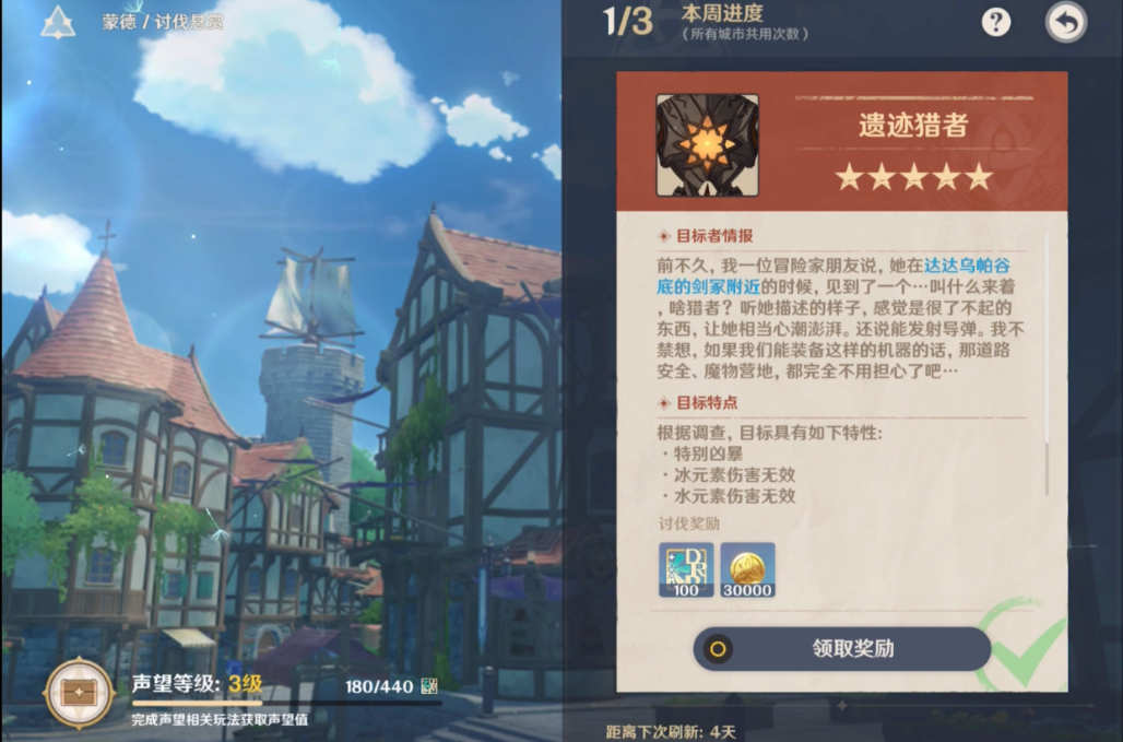 每周记得接取蒙德或璃月的讨伐悬赏和居民请求任务,这两个任务能白嫖不少摩拉,顺带还能完成纪行任务。如果声望等级满了,推荐在蒙德做任务,因为璃月的任务路线比较绕。另外深境螺旋通关也能拿到不少摩拉,练度不够的话打到12层就行,不用强求满星。