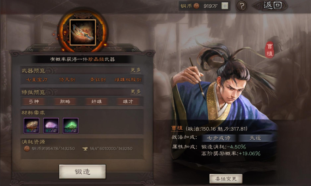 铁匠铺是获取武器和防具的核心建筑,需要将君王殿升到6级才能解锁。锻造装备需要消耗铁矿、铜币和材料,其中材料可以通过讨伐贼寇或寻访获得。锻造时记得委任政治和魅力值高的武将作为锻造官,比如曹植或步练师,这样能降低消耗并提高高阶装备的产出概率。随着铁匠铺等级提升,还能解锁中级、高级和顶级锻造,有机会打造出带特技的紫色或橙色装备。