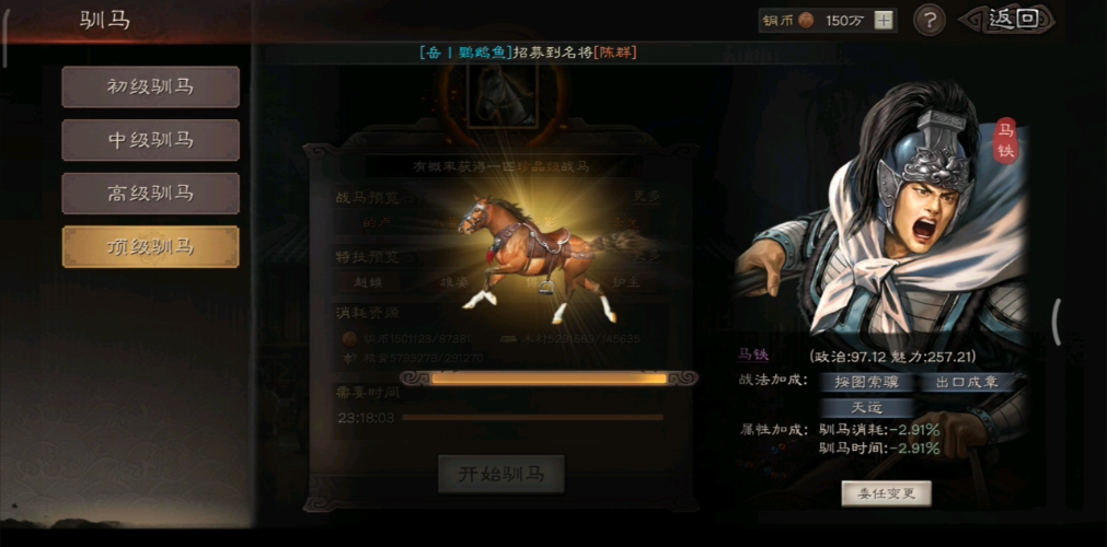 马匹的获取需要建造驯马场,君王殿达到9级后即可解锁。驯马同样需要消耗资源,并且耗时较长,建议委任刘表、张鲁等有驯马加成的武将,缩短时间并提高高品质马匹的产出率。马匹的属性随机生成,橙色和紫色马匹有概率附加特技,比如增加速度或武力,适合搭配对应的武将。