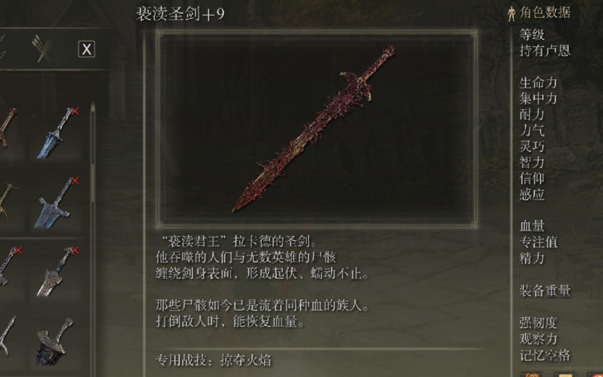 对于偏好重武器的玩家,玛利喀斯的黑剑在八周目依然强势。其战技命定之死能压制敌人起身,配合高周目的属性补正,伤害表现稳定。亵渎圣剑的火焰战技兼具范围伤害与生命恢复效果,适合持久战。尸山血海虽依赖出血机制,但战技的多段斩击在骨灰掩护下能快速清场,需注意其出手速度较慢的短板。