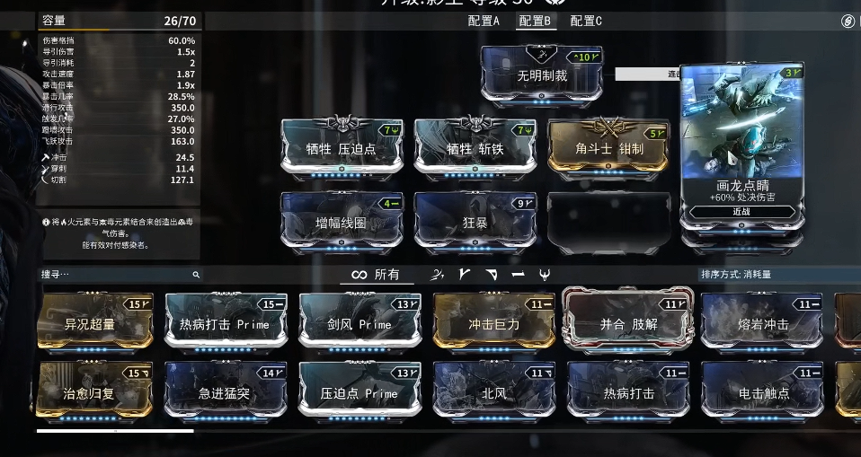 武器配卡方面,影生需兼顾输出与功能性。基础配置应包括牺牲压迫点、牺牲斩铁提升暴击伤害,急进猛突维持连击倍率,剑风Prime扩大攻击范围以便同时控制多个目标。创口溃烂和肢解可强化异常状态输出,而狂暴Prime或加速则优化攻速以缩短处决前摇。需注意隐身期间无法通过常规攻击刷新持续时间,因此需规划好每次处决的时机。