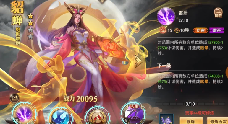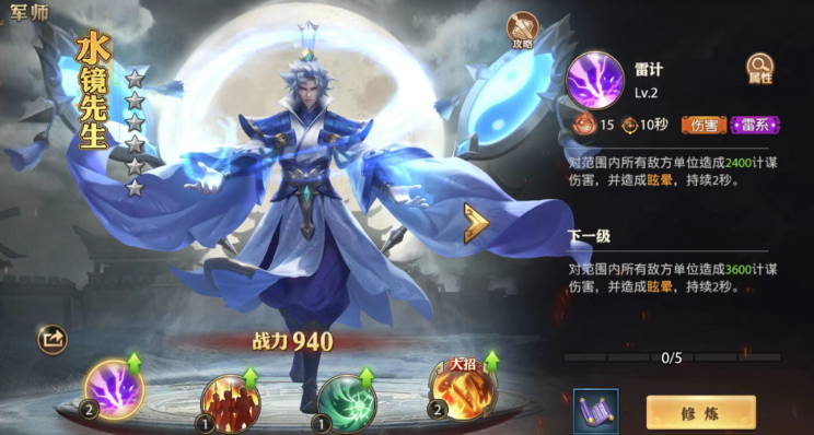 在培养优先级上,建议优先升级雷计和大招凤火九重,这两个技能是控场和输出的关键。战魂和风卷作为辅助技能,前期升到够用即可。水镜的碎片通过主线任务就能获取,晋升速度比其他军师快很多,所以很容易提升星级。记得把他的法器阴阳镜也同步强化,特别是提升计谋伤害和减少大招CD的属性,能显著增强实战表现。