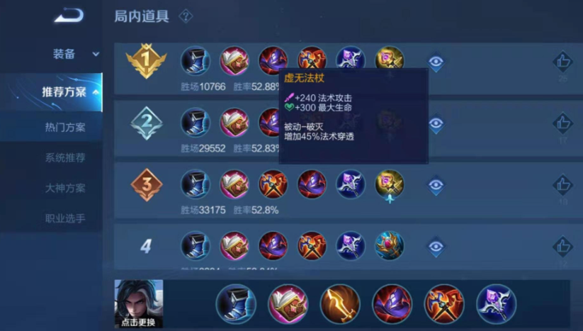 核心的输出装备有几件是公认的必出。噬神之书,也就是吸血书,可以说是司马懿的续航神器,能保证他持续作战和刷野时的状态,残血时也不用总着急回家。巫术法杖是另一个核心,因为它能强化司马懿使用技能后的那次普攻,让爆发伤害提高一个档次。博学者之怒,俗称帽子,能巨幅提升法术强度,出了之后伤害会有质变。最后一件输出装通常会在虚无法杖和痛苦面具之间选择,如果对面坦克英雄出了很多法术防御装备,那就出虚无法杖来穿透;如果更追求打脆皮时的额外伤害,痛苦面具也不错。