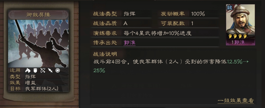 四星武将搭配方面,郭淮是性价比最高的搭档,其御敌屏障提供的前四回合双抗减伤能与刘备治疗形成复合防御体系。其他推荐搭配包括张梁补充群体法伤,皇甫嵩通过嘲讽吸引普攻配合虚弱控制。这类组合统御值较低(约11点),剩余统御空间可灵活配置输出将,适合资源有限时作为二队使用。