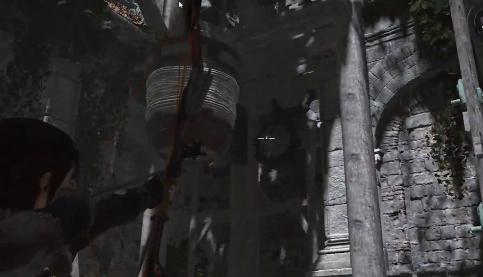 解谜的第一步是操作场景中的两个关键物件:一个推车和一个通过机关控制的水桶。你需要先跑到一边,用绳索拉动上方的拉杆,这个动作会释放一个配重锤。水流会注入桶中使其因重量增加而下沉。当这个水桶下落到地面附近时,时机就变得至关重要。你必须迅速返回到推车的前方,朝着正在下落的配重锤射出箭矢,用绳索将它和推车牢固地绑定在一起。这个操作成功的标志是配重锤被悬停在半空中。