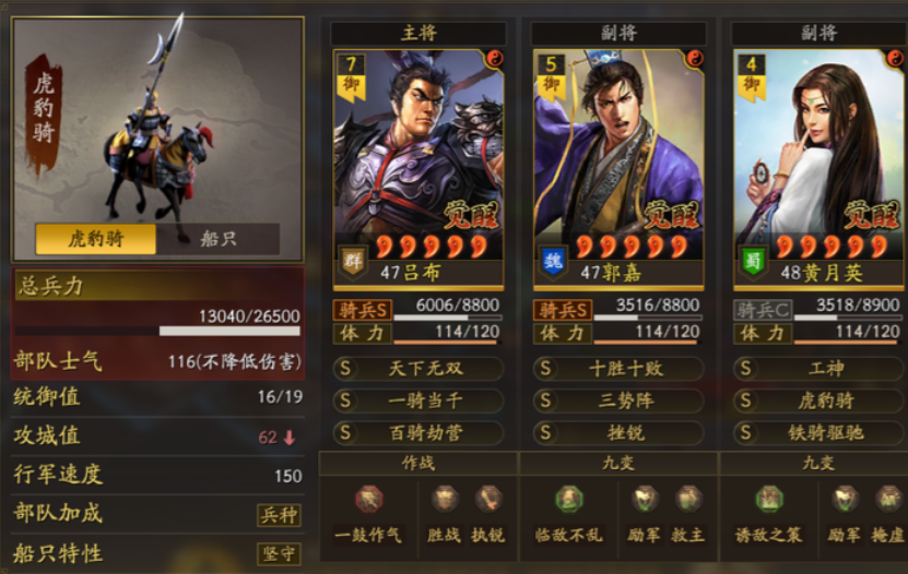 郭嘉的兵种适性均为A级,覆盖骑兵、弓兵与枪兵,这赋予了他在阵容搭配上较高的灵活性。在加点方面,通常推荐全智力加点,这能同步提升其辅助战法的效果与谋略伤害的强度。在一些特定配队中也需要调整属性,例如为了确保十胜十败的减伤能精准覆盖主将,可能需要让郭嘉的速度略快于主将;若期望他承担更多伤害或配合暂避其锋战法,则可能需要调整智力与统率的加点比例。其传承战法沉沙决水在当前环境中的使用率相对有限,因此通常建议保留武将以发挥其本体价值。