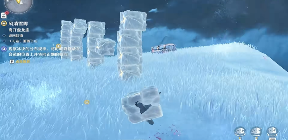 除了环木阙,游戏世界的其他区域也分布着相似的叮咚咚挑战。在乘霄山区域的卧龙冈左侧以及盘龙崖等处,玩家同样会遇到需要化身叮咚咚进行摆放的解密环节。这些挑战的设计逻辑相通,均要求玩家首先找到并接触挑战点,化身后依据场景中给出的图案提示进行逻辑推理,关键在于找准自身所代表的冰块应处的行列与间隔,并通过游戏内的旋转技能调整朝向,最终使整体图案变得完整。