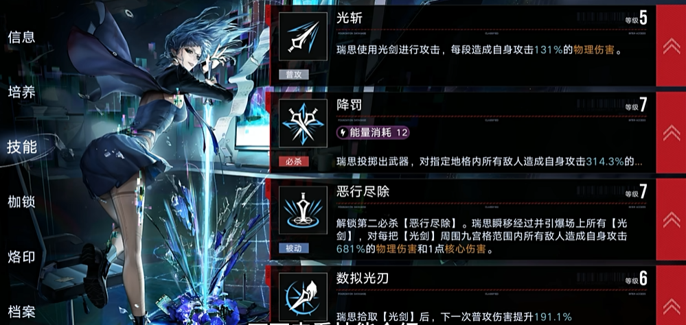 无期迷途瑞思技能加点优先顺序为:被动数拟光刃>必杀>普攻>被动恶行尽除,资源有限时按此顺序拉满,核心输出与破核效率直接拉满。