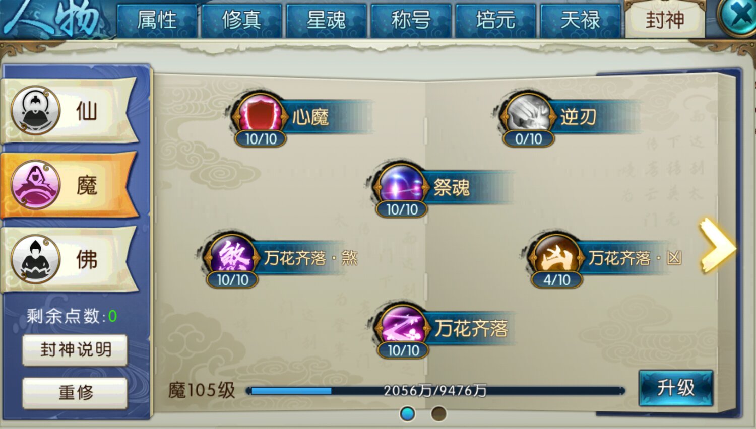 技能加点是云梦封神玩法的核心环节。爆发流推荐主入阵辅不破的天书组合,强化输出能力,技能优先点满彩云追月、百花缭乱和移花接木;控场流需主不破辅空谷,提升控制稳定性,重点升级木灵缚和昆山玉碎;消耗流则以空谷天书为核心,搭配枯木逢春和春风化雨增强续航。被动技能如根劲、风语等需根据流派补足属性短板,连续技设置需确保控制与爆发的衔接流畅。