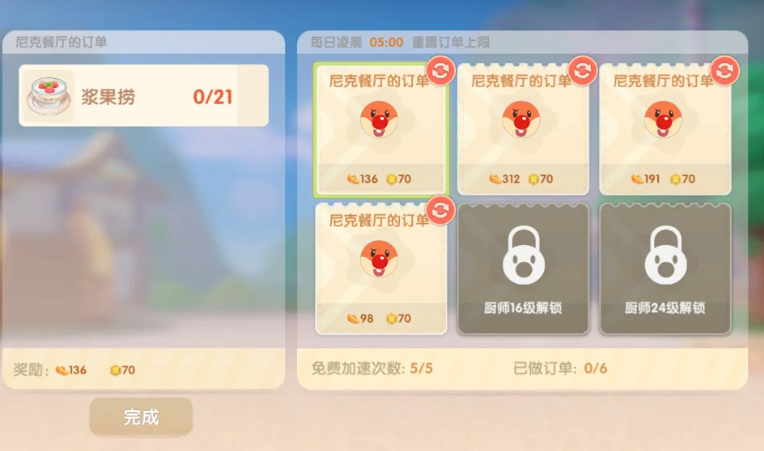 餐厅每天只能营业2小时,期间顾客只会选择已经制作好并摆在出菜口的菜品。建议在营业前完成所有订单菜品制作,否则可能无法及时满足顾客需求。每天凌晨5点订单任务会重置,记得把握时间规划。可以使用加速功能立即结算已准备好的菜品,但需要确保有足够库存。每天还有5次快速制作机会,合理利用能事半功倍。餐厅布置和装扮会影响豪华值与好评度,这些因素直接关系到客流量和小费收入。可以考虑使用餐厅好评手册道具来快速提升好评度。