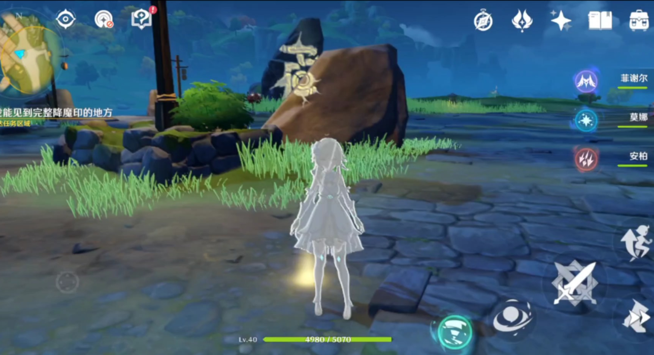 站在黄色光点点位上,将游戏镜头对准前方刻有符文的三块石头。这个过程需要耐心调整镜头方向,通过不断微调使三个石头上的分散符文逐渐对齐。当所有符文完美拼合时,会触发强烈的金色光芒特效,这表示降魔印已完整呈现。符文拼合时不会自动触发任务进度更新,需要玩家进行一次普通攻击操作才能使系统确认解谜完成。