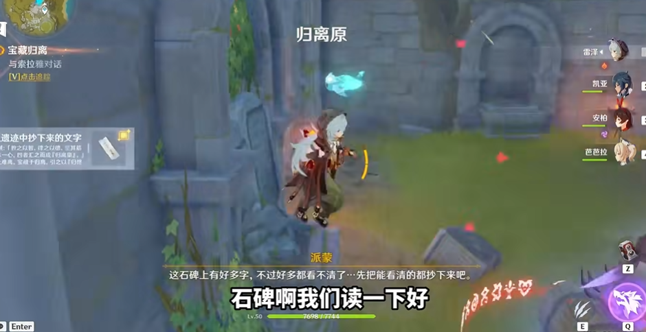 触发宝藏归离任务需要前往归离原遗迹区域,在坐标点附近找到名为索拉雅的NPC学者。该NPC位于归离原南部道路旁的石柱遗迹处,靠近后会触发对话选项,选择互动即可接取任务宝藏归离。任务分为上下两阶段,第一阶段需在遗迹范围内探索五块古代石碑,第二阶段则需激活四个圆盘机关并击败守卫。