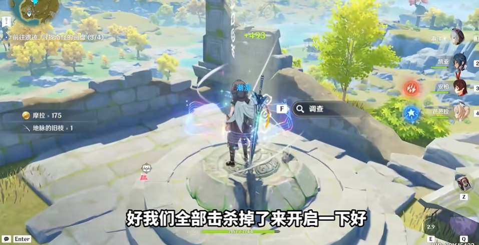 第二阶段任务需传送至望舒客栈,在客栈二楼露台再次与索拉雅对话。任务目标变更为激活四个遗迹圆盘,圆盘分别位于归离原东南西北四个方向的遗迹群中。每个圆盘周围存在元素屏障或怪物守卫,例如西侧圆盘需击败火深渊法师,北侧需清除风史莱姆形成的风墙。激活全部圆盘后,需前往归离原中央的水潭区域启动最终机关,触发三只遗迹守卫的战斗。
