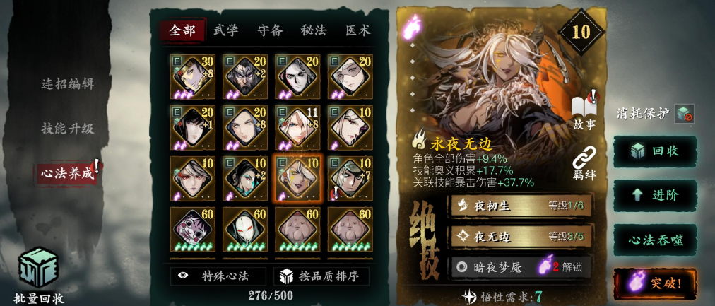 心法搭配方面,前期有啥用啥,但尽量选增加攻击或减CD的。永夜和梦华是不错的选择,能减少技能冷却让连招更流畅。银月心法提升破甲效果,对付高护甲敌人很实用。装备优先选攻击力和暴击属性,铁君子套容易获取且属性均衡,适合过渡。