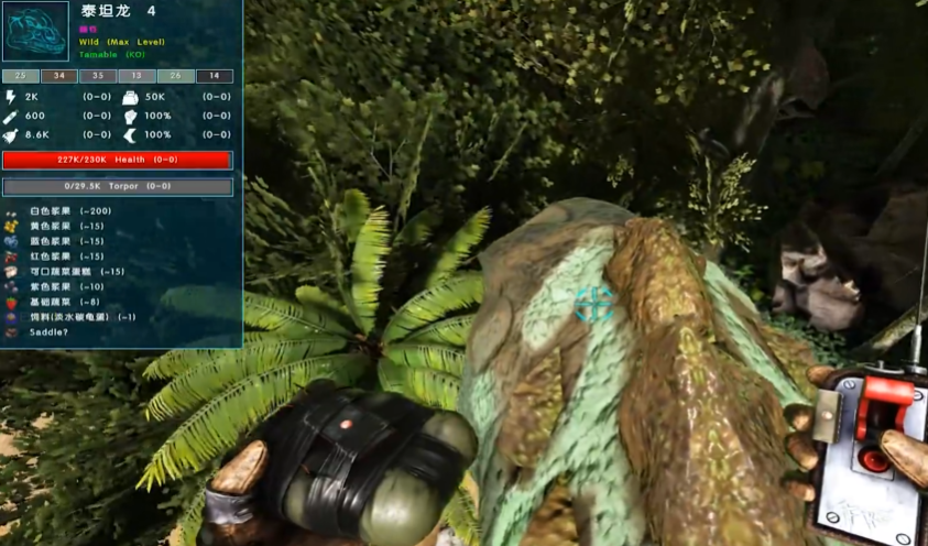 实际操作时要保持耐心,有时候轰击头部可能不会立即显示眩晕效果,这是正常现象。单机模式下如果遇到无法造成眩晕的情况,重启客户端就能解决。记得在泰坦龙眩晕后立即装上平台鞍完成驯服。驯服后的泰坦龙会开始绝食,大约16-20小时后就会饿死。