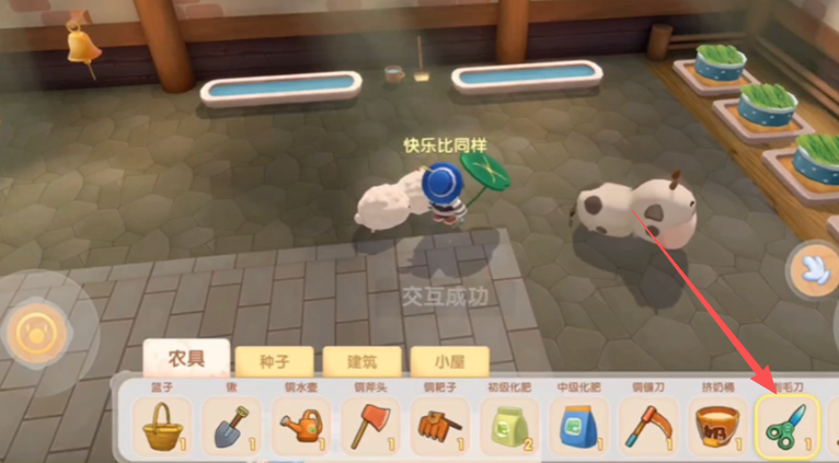 剪羊毛的具体操作需要玩家达到农夫26级解锁相关功能。进入畜棚小屋后,找到成年绵羊,在农具栏选择剃毛刀工具,靠近绵羊点击使用即可完成剪毛。需绵羊会在畜棚内自由走动,玩家需要主动靠近目标才能进行操作。每次剪毛后需要等待产出时间结束才能再次收获。