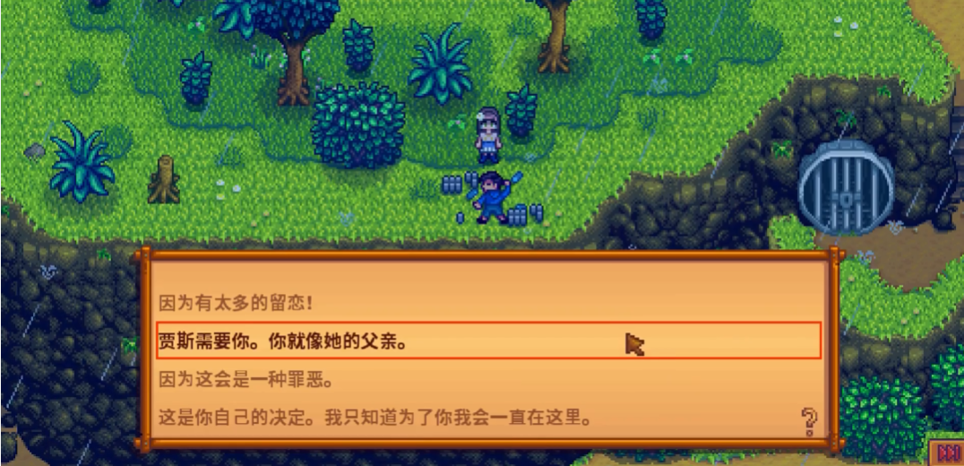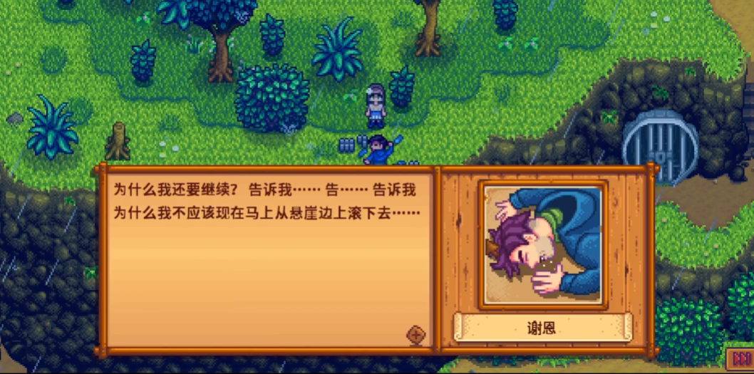 第二天谢恩会主动登门致谢,对话选项同样不影响后续发展。这个事件标志着谢恩开始正视自身问题,为后续8心剧情中养鸡的转变做铺垫。若想稳定触发该剧情,可使用雨水图腾改变天气,确保在指定时间段前往煤矿森林时必定为雨天。