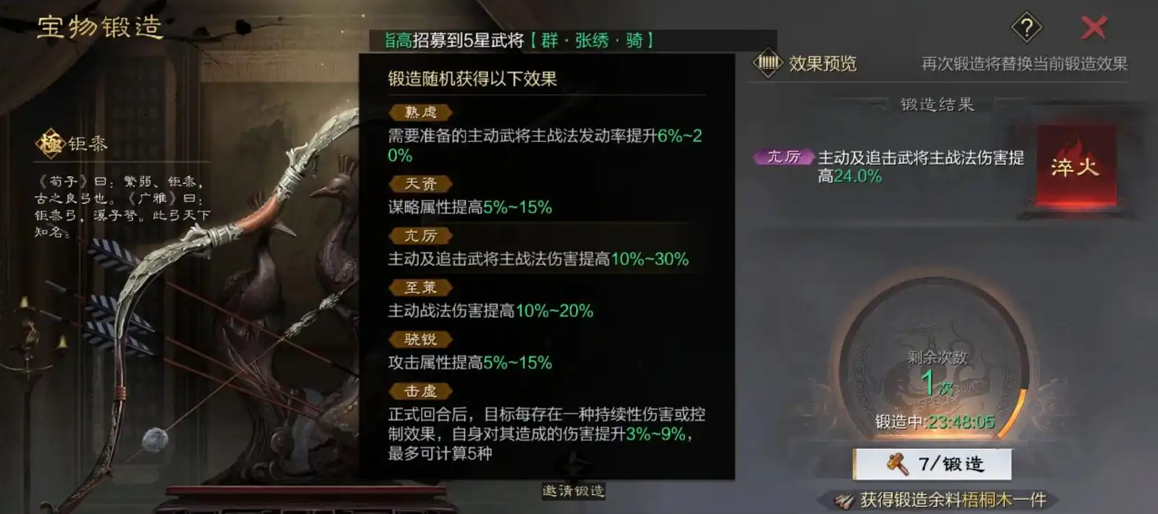 最基础的方式就是通过陈情系统里的工匠来打造宝物。每天系统会随机刷新工匠事件,找到寻访名匠后接见,就能进入打造界面。不同工匠能做的宝物类型不一样,选好想要的点击打造,等24小时就能拿到手。如果等不及,也可以花点虎符跳过等待时间。打造有概率出次品,这种宝物没啥用,只能留着赛季结束自动清掉。