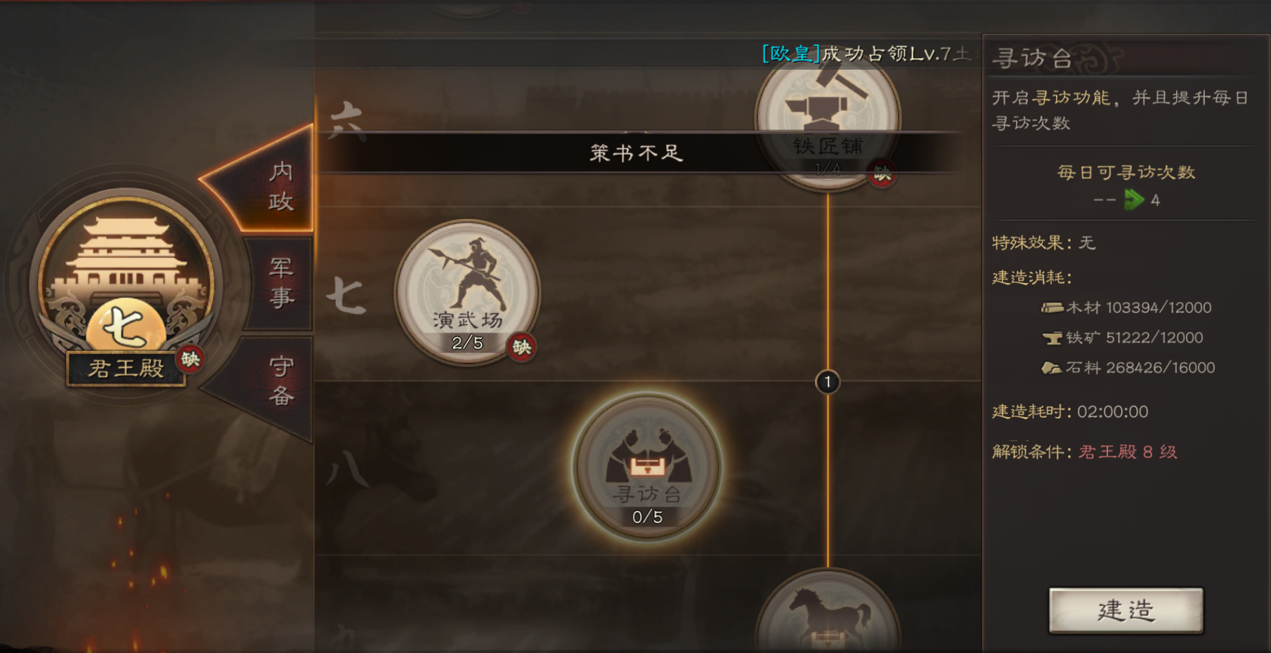 兵站系列建筑能提高武将的武力、谋略、统率和速度属性,军营则能增加带兵上限,这些都需要优先升级。君王殿的等级决定了其他建筑的解锁进度,尽早升到7级可以开启演武场练兵功能,快速培养新武将。工械所的科技研究也不容忽视,优先选择能提升兵种属性、资源产量和部队士气的核心科技,平衡分配资源才能全面发展。