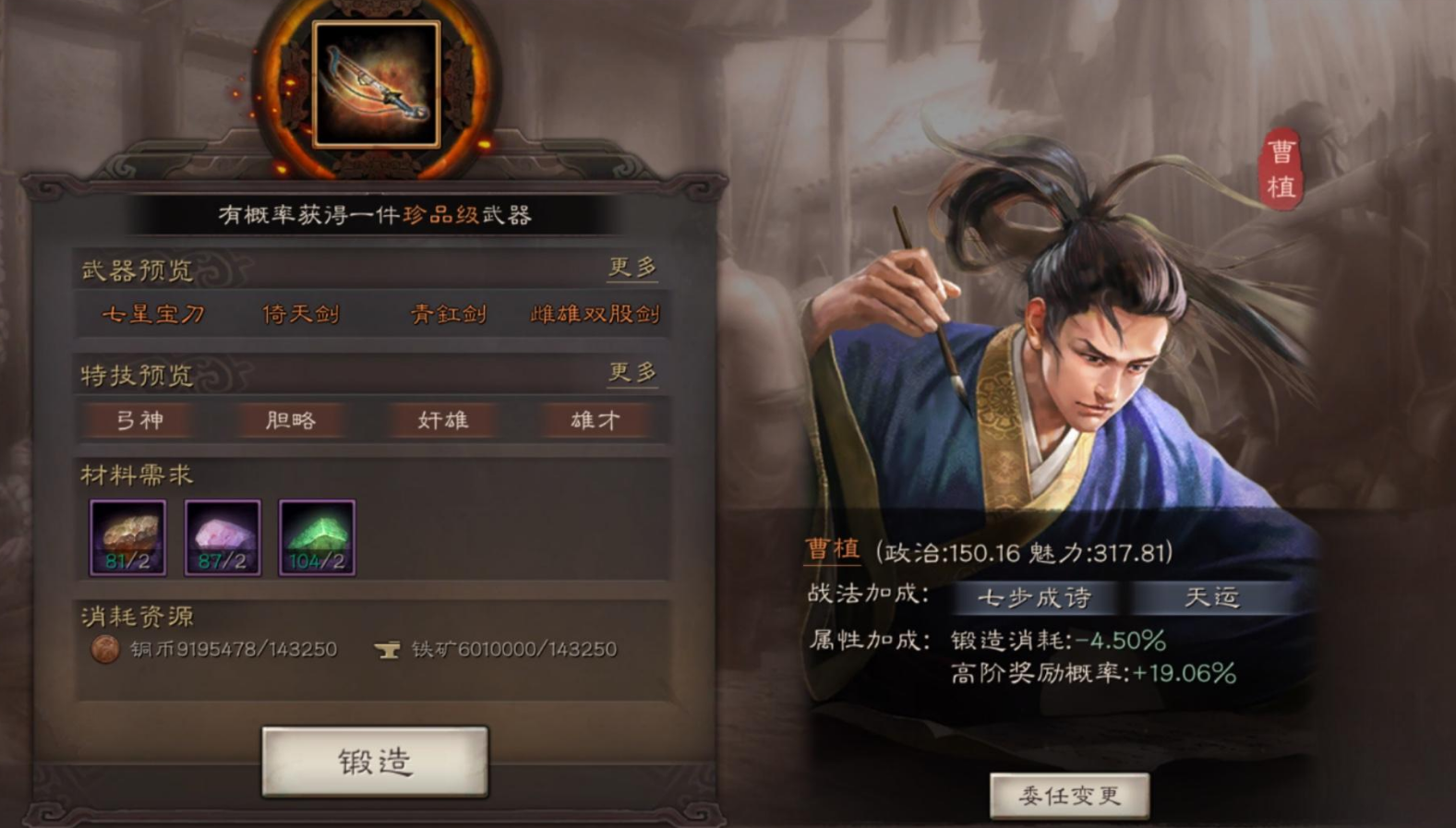 虽然低级锻造对锻造官要求不高,但选择政治和魅力属性高的武将还是能提升效率。曹植和步练师是理想的锻造官人选,没有的话用其他高魅力武将也行。前期资源有限,建议集中材料打造几件关键部位的装备,比如主力的武器和防具,不用急着给所有武将配齐装备。