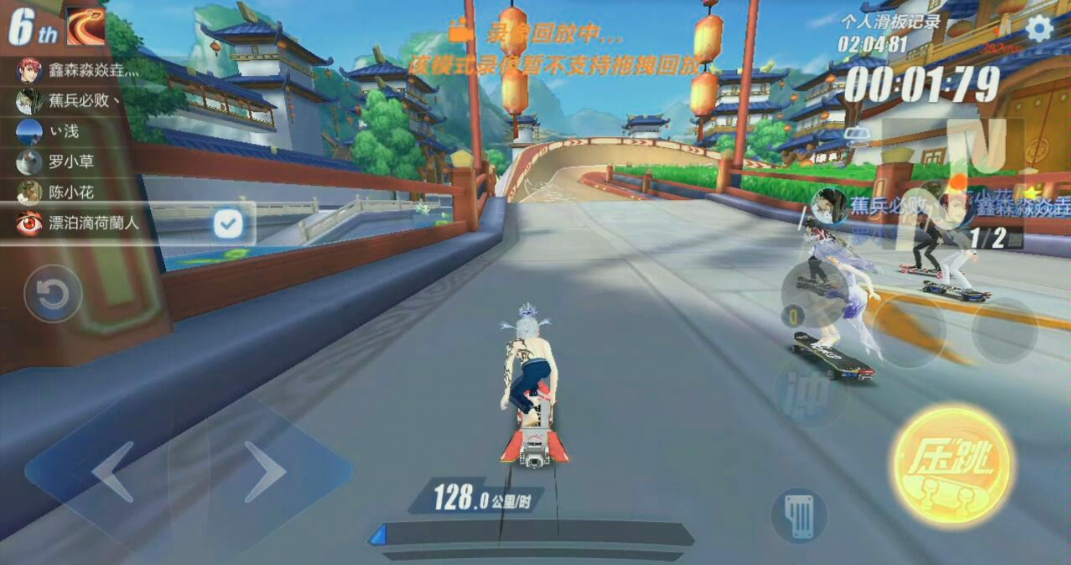 滑板模式里有两个关键操作:压跳和冲刺。按住压跳键可以下蹲压板,这时候速度会变慢但转弯更灵活,松开就会跳起来。短按是小跳,长按直到出现漂焰再松开就是大跳,跳得更高。在空中时如果看到冲按钮亮起,点一下就能空中旋转加速,落地后再点冲刺还能进一步提速。滑杆和碗池是赛道上的特殊地形,滑杆会自动前进并加速,碗池下半部分也有额外加速效果,记得多利用它们。