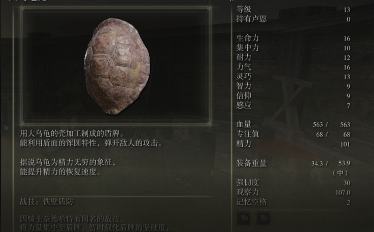大龟壳盾是前期生存能力的重要保障,位于啜泣半岛的上升气流附近。该盾牌不仅提供高防御强度,还附带提升精力恢复速度的被动效果,其战技铁壁盾防能大幅减少防御时的精力消耗。搭配指纹盾与大山羊套装可形成极强的防御体系,适合应对高攻击频率的敌人。护符方面,珍珠龙护符+1能有效降低火焰、毒等属性伤害,获取路径需通过龙墓区域的威达姆废墟。