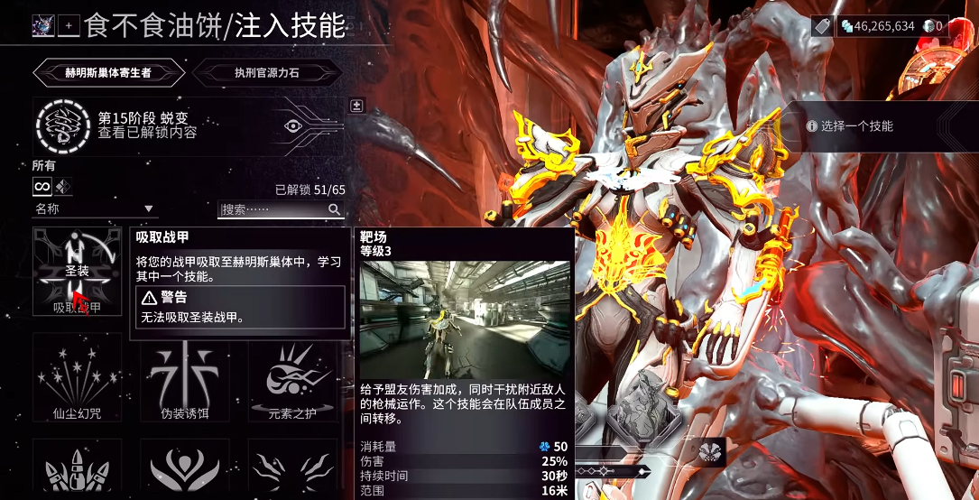 技能移植的前提是让大嘴吞噬普通战甲。每个普通战甲只能被吞噬一次,消化过程需要二十三小时,完成后会解锁该战甲特定的可移植技能。例如狂野犀牛的三技能牛吼就是固定可移植技能。被吞噬的战甲会在地面留下不同颜色的小花作为标记。需圣装版本战甲无法被吞噬,因此若想获取某战甲的技能,必须保留其普通版本并升到满级。