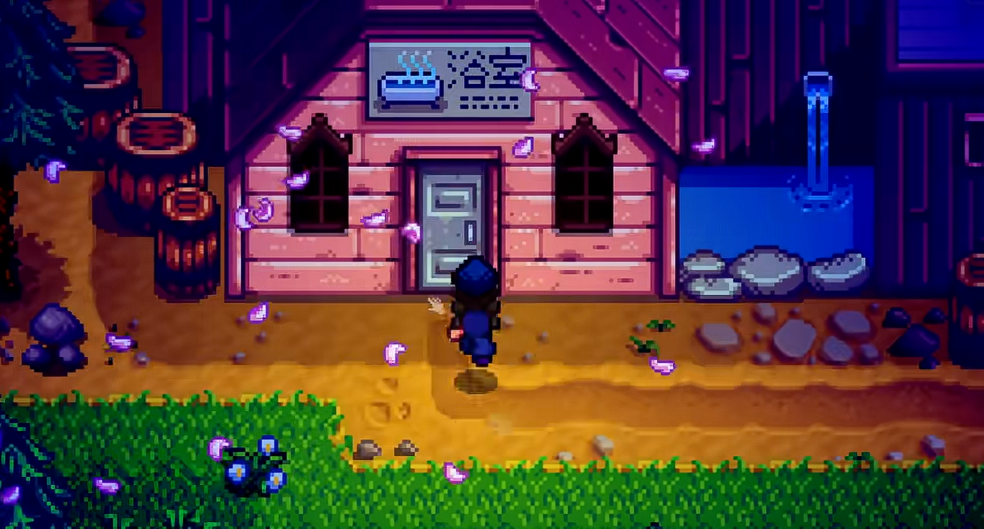 温泉的位置位于游戏地图北部,罗宾家后山的一条小路上。最初这条路被巨石堵住,但在游戏第一年夏季第三天,星露谷会发生一场地震,震开堵塞的道路,玩家便可前往温泉。温泉24小时开放,任何时间都可使用。进入温泉前,玩家需要更换泳装,这一过程是自动完成的,更衣室分男女,不能进错。温泉内部设计类似游泳馆,玩家进入后会减速,浸泡在池中即可开始恢复体力。