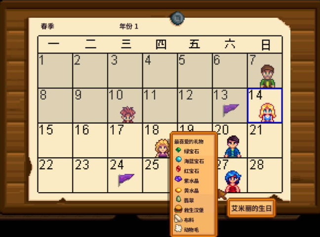 送礼物之前记得先了解居民的喜好,不同人对礼物的反应差别很大。五彩碎片、兔子的脚和黄金南瓜是大多数居民的最爱,但海莉讨厌五彩碎片,潘妮不喜欢兔子的脚。平时可以多观察居民的对话反应,或者查查喜好表格,送对礼物能大幅提升好感度。生日当天送礼效果最好,好感度加成是平时的八倍。