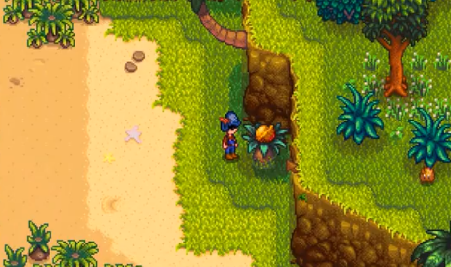 如果觉得探索太慢,也可以攒够50个金核桃找旅行商贩黛咪摩尔直接购买。金核桃可以通过钓鱼、打落火山入口右侧树上的果实等方式获取。记得每天去火山那边看看,树上固定会刷新5个金核桃,用弹弓就能打下来。