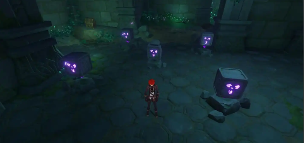 水位下降后需要寻找并引导两个仙灵来开启右侧大门。其中一个仙灵位于柱子上方,另一个则在大祓树左侧位置。完成仙灵引导后,左侧机关区域会出现宝箱奖励,同时附近水潭的水位会再次下降。需要游过水道,在水道尽头可以发现五个机关阵列,激活这些机关后水位将完全退去。
