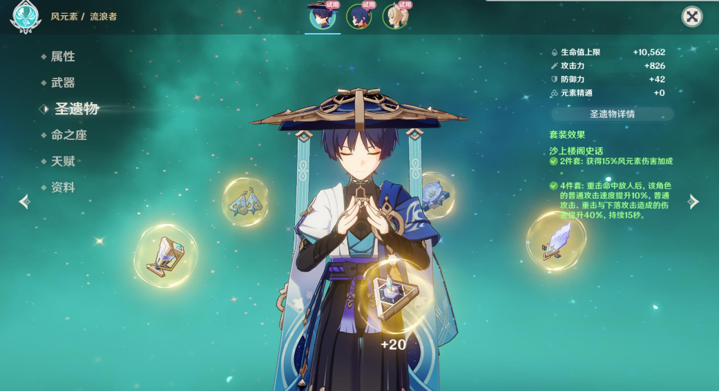在战斗机制上,流浪者以风元素普攻为核心输出手段,元素战技强化普攻并赋予浮空能力,元素爆发则提供范围伤害。其天赋拾玉得花可通过元素反应提升属性,搭配冰、水等后台角色能显著增强输出效率。圣遗物推荐沙上楼阁史话或来歆余响,前者侧重攻速与普攻加成,后者则依赖概率触发增伤效果。武器选择上,专武图莱杜拉的回忆最优,四星中匣里日月和流浪乐章可作为替代。
