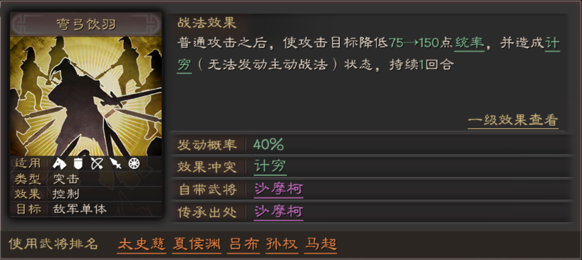对付折冲最直接的办法就是优先解决携带它的武将。比如太史慈这种高频普攻的武将,通常会搭配折冲来频繁触发效果。如果能快速控住或者集火秒掉他,折冲的威胁就小了很多。像技穷、震慑这类控制技能特别管用,可以打断对方的普攻节奏,让折冲没法顺利触发。弯弓饮羽这种同样能降低统率的战法也能和折冲的效果叠加,利用这点可以更快破防。