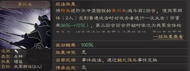 说到蜀枪最常带的兵种,青州兵绝对是枪兵专属里的明星选择。这个兵种的战法特性很有意思,当部队造成伤害时,不但能提高本次造成的伤害数值,还会同步降低敌军下一次攻击所能带来的伤害,这种双向的增益和减益效果就让枪兵在进攻端更有压制力,同时也兼顾了一些生存能力,特别适合蜀枪这种追求前中期建立优势的打法。