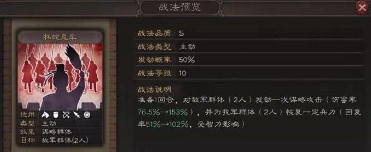 诸葛亮适合学习的A级战法种类丰富,每种都有不同的侧重点。料事如神可以对敌军两人造成谋略伤害并降低其输出,攻守兼备的属性很搭诸葛亮的风格。风声鹤唳能施加沙暴状态,造成持续伤害,输出能力不俗。杯蛇鬼车则需要一回合准备,能同时带来群体谋略伤害和兵力恢复,兼顾了续航和伤害输出。无当飞军则是弓兵专属战法,能提升全队统率和速度,同时附加中毒效果增强整体压制力。这些战法不需要太高的获取门槛,让平民玩家也能轻松培养出强力的诸葛亮阵容。