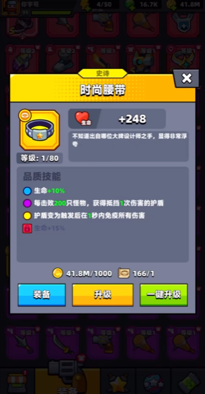 关于紫色腰带,比较多的几个选择主要是时尚腰带、永恒腰带、扭曲腰带和军用腰带。它们各有各的亮点,适合的场景和你的打法风格有很大关系。先聊聊比较亲民的时尚腰带,这可以说是除了永恒腰带之外非常强的一个选择了。它的属性成长很清晰,蓝色品质时增加10%生命值,到了紫色品质会解锁一个很有用的效果:每击杀200个怪物就能获得一个抵挡一次伤害的护盾。这个效果在前期推图或者怪物海关卡里特别好用,因为击杀200个怪对于割草游戏来说并不难,相当于能比较频繁地刷出护盾来保命。等升到金色品质,这个护盾会触发后会有一秒的无敌时间,生存能力又提了一档。时尚腰带的获取难度相对低一些,效果也很实在,特别适合平民玩家作为核心腰带培养。