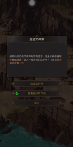 异界庇护所的过程其实挺简单,你需要先去东托比亚城郊的地图,在那里仔细找到一个渥金女神像并点击调查它,这个过程会触发一段剧情,接着就能进入异界庇护所的副本开始挑战。这个入口位于西托比亚的女神像位置,也就是东托比亚区域;首先通过西托比亚的风栖旅店花费一些银币进入东托比亚,然后把那里所有的地图都刷完,就能开启中间的女神像,击败守关的BOSS后就可以正式开启庇护所副本了。