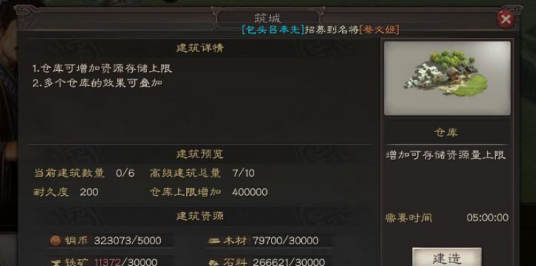 除了乐府,十级地还能支持建造更高级别的仓库。仓库的作用是提升各项资源的储存上限,防止因产量过高而爆仓浪费。游戏进程推进,特别是拥有了十级地这样的高产出地后,资源产量会大幅提升,低级仓库的容量很快会捉襟见肘。在十级地上升级或建造高级仓库,能确保你将丰厚的资源收益稳稳地存入囊中,为升级更高等级的主城建筑、征募更多士兵提供坚实的后勤基础。