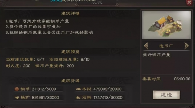 游戏中个人可建造的高级建筑总数存在上限,这个上限与你的名声值挂钩。像乐府这样的建筑,虽然功能强大,但拥有数量限制。在规划用地时,你需要做出战略取舍。玩家会优先在十级地上建造功能独特且无法替代的建筑,比如乐府,因为它提供的体力增益是其他方式难以弥补的。而在其他等级的土地上,则可能规划造币厂或工坊等增加资源产出的建筑。